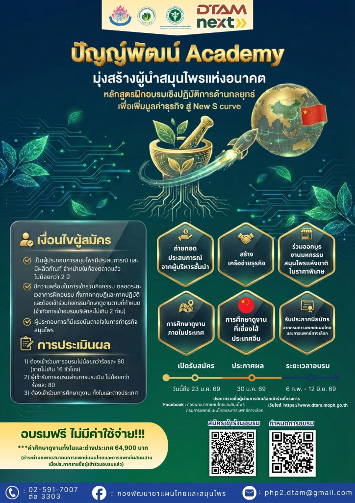 สำหรับรายละเอียดการสมัครและการคัดเลือก เริ่มอบรมวันที่ 6 กุมภาพันธ์ – 12 มิถุนายน 2569 (รวม 86 ชั่วโมง) ค่าใช้จ่ายอบรม ฟรี ตลอดหลักสูตร (ยกเว้นค่าศึกษาดูงานทั้งในและต่างประเทศ) ปิดรับสมัคร วันที่ 23 มกราคม 2569 พร้อมทั้งประกาศผลคัดเลือก ในวันที่ 30 มกราคม 2569 ผ่านทาง Facebook : กองพัฒนายาแผนไทยและสมุนไพร กรมการแพทย์แผนไทยและการแพทย์ทางเลือก