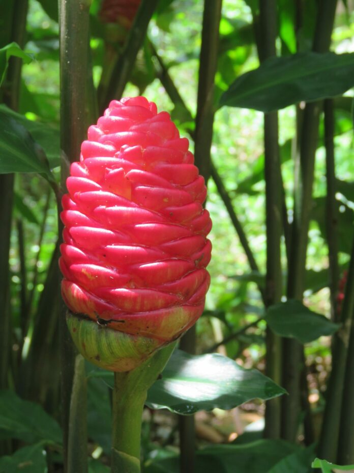 ออกเป็นช่อแทงออกจากเหง้าขึ้นมา ช่อดอกรูปทรงกระบอก มีใบประดับสีเขียวแกมแดง เรียงซ้อนกันแน่นเป็นระเบียบ ดอกสีเหลือง โคนเชื่อมติดกันเป็นหลอด ดอกบานไม่พร้อมกัน