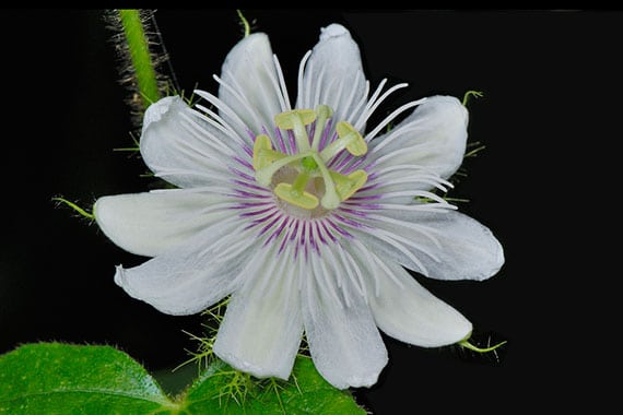 ดอกเป็นดอกเดี่ยว ออกตามซอกใบ ดอกมีกลีบดอก 10 กลีบ กลีบดอกด้านนอกเป็นสีเขียวอ่อน ส่วนกลีบด้านในเป็นสีขาว มีกระบังรอบเป็นเส้นฝอยมีสีขาวโคนม่วง ส่วนกลีบเลี้ยงของดอกเป็นเส้นฝอย ดอกมีก้านชูเกสรร่วม แยกเป็นเกสรตัวผู้ประมาณ 5-8 ก้าน ส่วนก้านเกสรตัวเมียมีประมาณ 3-4 ก้าน รังไข่เกลี้ยง[
