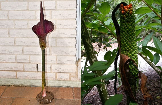 - ดอกบุกเป็นสีเหลือง บานในตอนเย็นมีกลิ่นเหม็น คล้ายหน้าวัว ประกอบด้วยปลี และจานรองดอก จานรองดอกมีเส้นผ่านศูนย์กลาง 12 – 15 ซม. เกสรตัวผู้และตัวเมียรวมอยู่ในดอกเดียวกัน แต่แยกกันอยู่คนละชั้น เมื่อบานจานรองดอกจะโรย เหลืออยู่แต่ปลีดอก ซึ่งจะกลายเป็นผล ก่อนออกดอกต้นบุกจะตายเหลือแต่หัว ซึ่งเป็นก้อนกลมสีขาว ขนาด 6 – 10 ซม.เจริญเติบโตอยู่ใต้ดิน