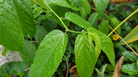 - ใบ เป็นใบเดี่ยวออกจากกิ่ง ออกตรงข้ามกัน เรียงตัวแบบสลับ มีสีเขียว ด้านหลังใบเขียวอ่อนกว่าหน้าใบเล็กน้อย ขอบใบเรียบหรือมีหยักเล็ก ๆ โดยเฉพาะปลายใบหยักเล็กน้อย รูปใบแบบไข่หรือรี ปลายและโคนใบแหลม ฐานใบกว้างรูปหัวใจ ก้านใบยาว 1-1.3 ซม. ใบกว้าง 4.5-5.8 ซม. และยาว 8.5-12.7 ซม.ผิวใบสากเนื้อใบหนาและเหนียว เส้นแขนงใบแบบขนนกมีจํานวน 7-8 คู่